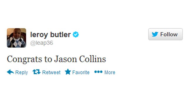 Former NFL star LeRoy Butler was to speak to a Church children’s congregation that, as a decent person, he would not name. This because of a TWEET–“Congrats to Jason Collins”. THAT was it. He was told he could redeem himself by removing the tweet, ask for God’s forgiveness, and apologize and they would allow him—yes, allow him—to address the children on BULLYING—of all things. Major props to LeRoy Butler for respectfully refusing this ultimatum. “I told the Pastor, blame it on my mom because my mom brought me up to love everybody,” he said.